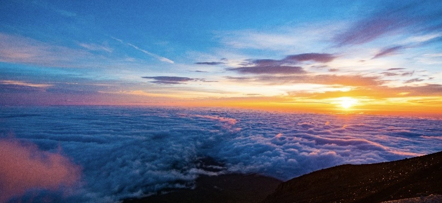 Reaching the top was met with both a sense of relief and exhilaration. Joined with hundreds of other people in the darkness of night, awaiting the sunrise, people huddled together in the frigid cold and blustery winds awaiting the first signs of light from the East. Eventually, the mists and clouds surrounding the summit gave way to the sun rising above the clouds far below, and the cheer of greeting the new day was shared by all. We had braved the final kilometers of hiking in the dark, the bone-chilling winds and the near-freezing temperatures to be in a special place that most people will never experience. The sunrise was enough to bring tears to my eyes for having the privilege to be in this space at this moment, and I gave silent thanks for being able to witness and savor the moment. The sweat and struggle of the journey was replaced with the awe and beauty of nature unfolding before us and we were all experiencing a moment never to be recreated again.