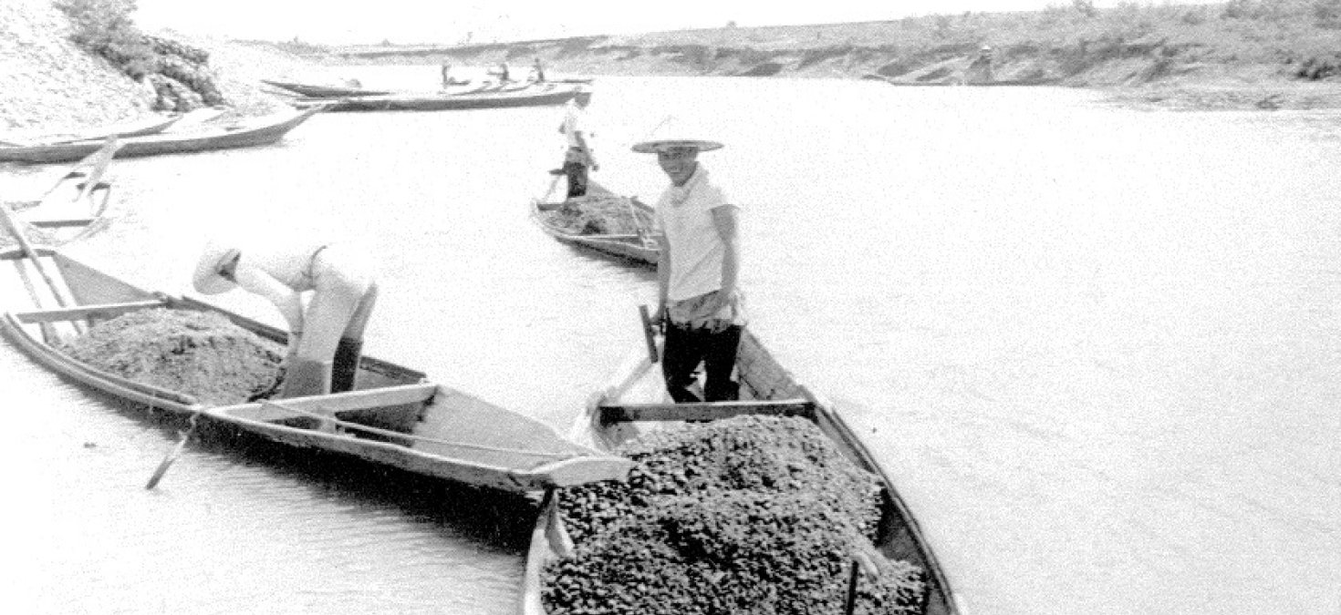 In this image of honryousen, men are dredging sand, a seasonal job as the river channels constantly silted up. Large post-War drainage projects allowed roads to be built, which made most of these boats obsolete as farmers purchased trucks.