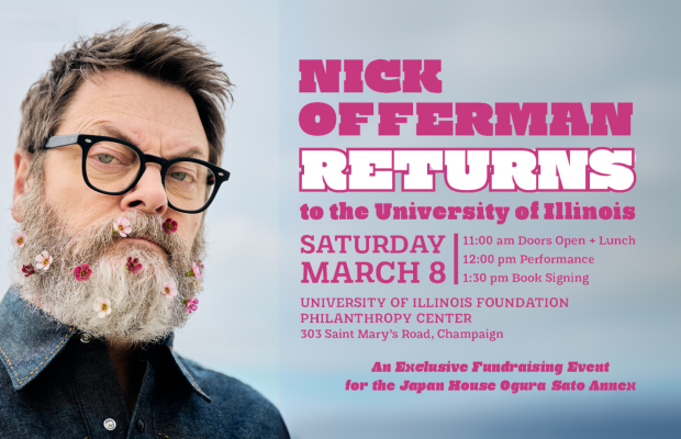 Japan House continues to fundraise to make the Ogura-Sato Annex possible with the rising costs of construction. With the generous support of Nick Offerman, he performed a sold-out show at Foellinger Auditorium in August featured an evening of deliberative talking, mirth, and music. Topics included but were not limited to: beef, comportment, eggs, bacon, pork, breakfast, barbecue, steak, meat, and Illinois Kabuki Theatre.