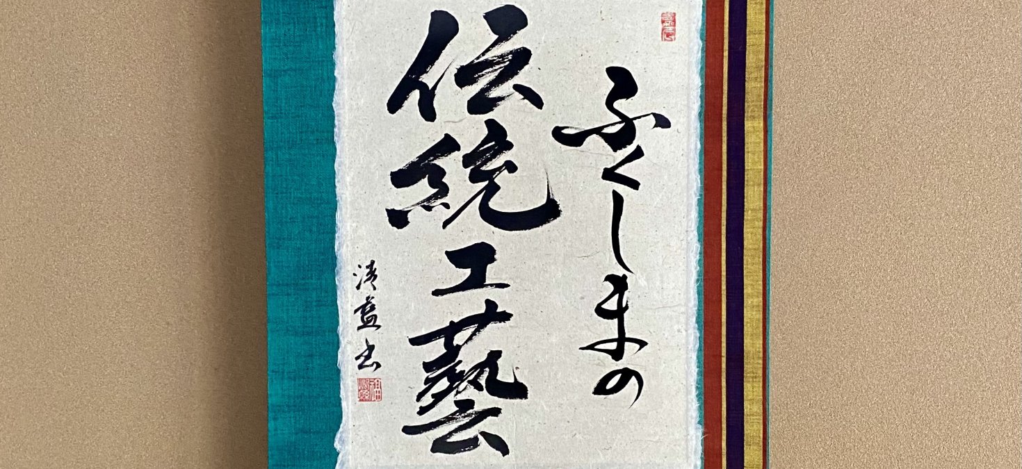 The image above features a calligraphy execution by Seiran Chiba that translates to "Traditional Crafts of Fukushima." The scroll itself is made of Aizu Momen (cotton) and Kamikawasaki Washi (paper) from Fukushima.