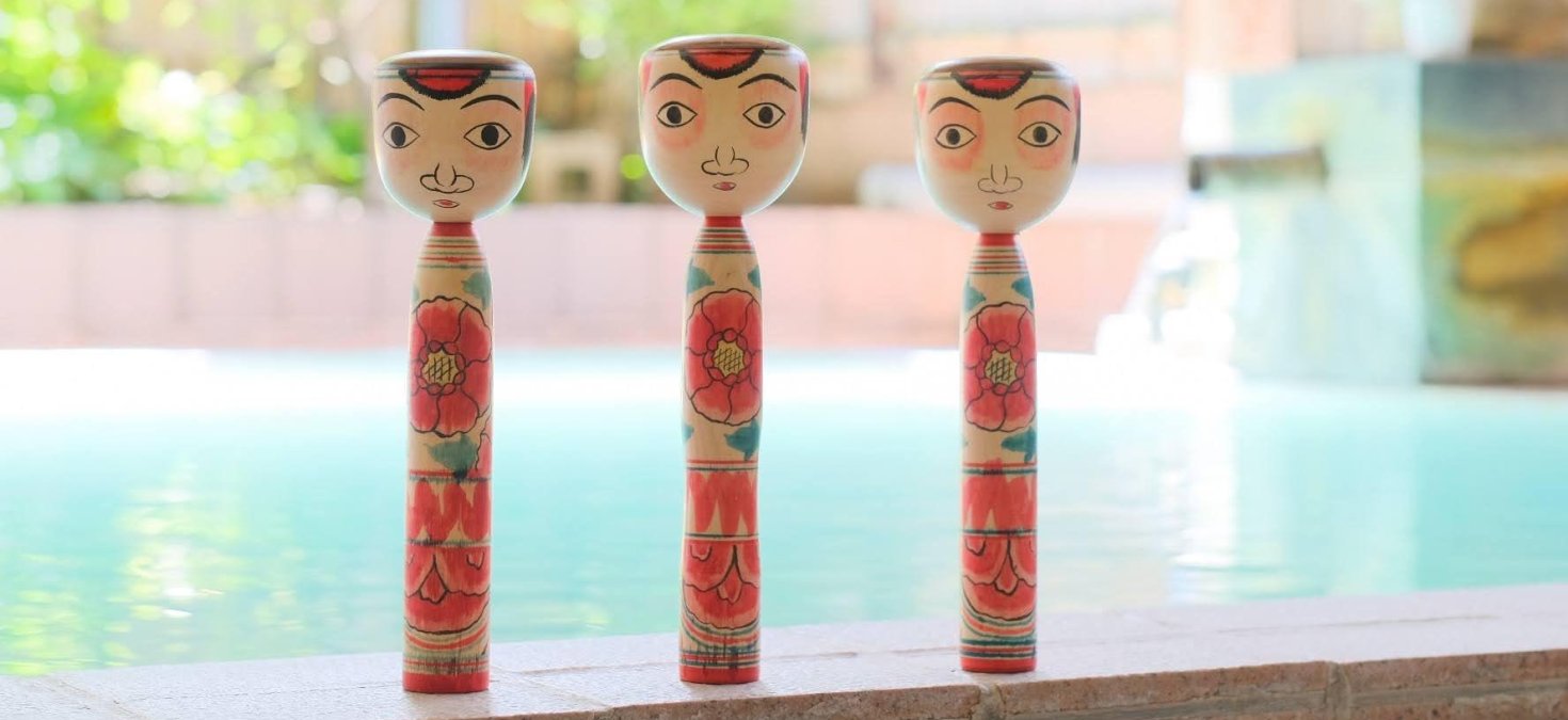 Featured above are kokeshi dolls from the Fukushima Kokeshi Craftsmen's Association. Please visit Spurlock Museum's exhibition for detailed information about each artist and their pieces displayed.